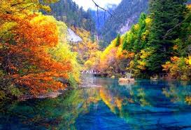 Me encanta este paisaje, es muy bonito. Hay árboles, sus hojas tienen tres tonos: Un color que es como naranja con un tono rojo, detrás hay otro árbol que está en un tono amarillo y el verde ya se está volviendo amarillo. Hay agua que es cristalina, muy azul, en la que se reflejan los árboles. Detrás hay montañas, y el cielo está azul.